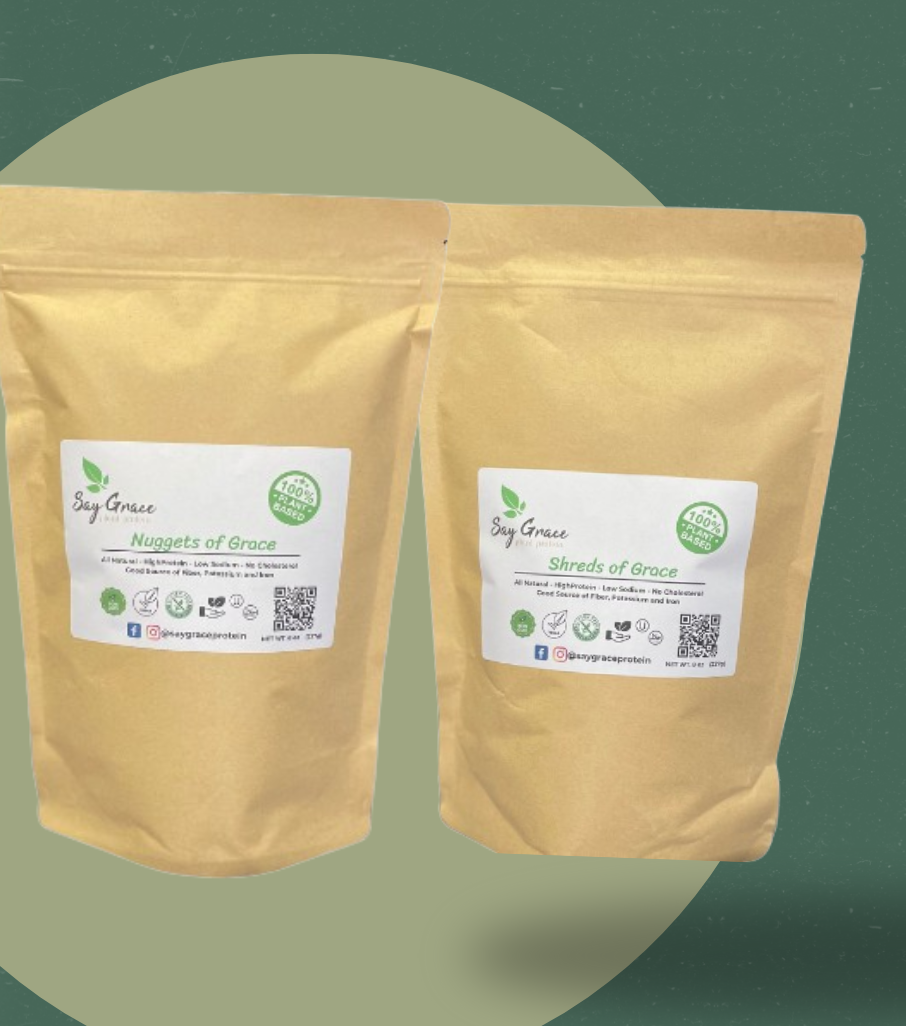 Our Nuggets and Shreds of Grace are the same Soy Protein Concentrated product, baked into different shapes. The Shreds are great for fajitas, tacos, and soups! The Nuggets are great as chickless nuggets ready to dip in your favorite BBQ Sauce, or as a boneless chickless wing!