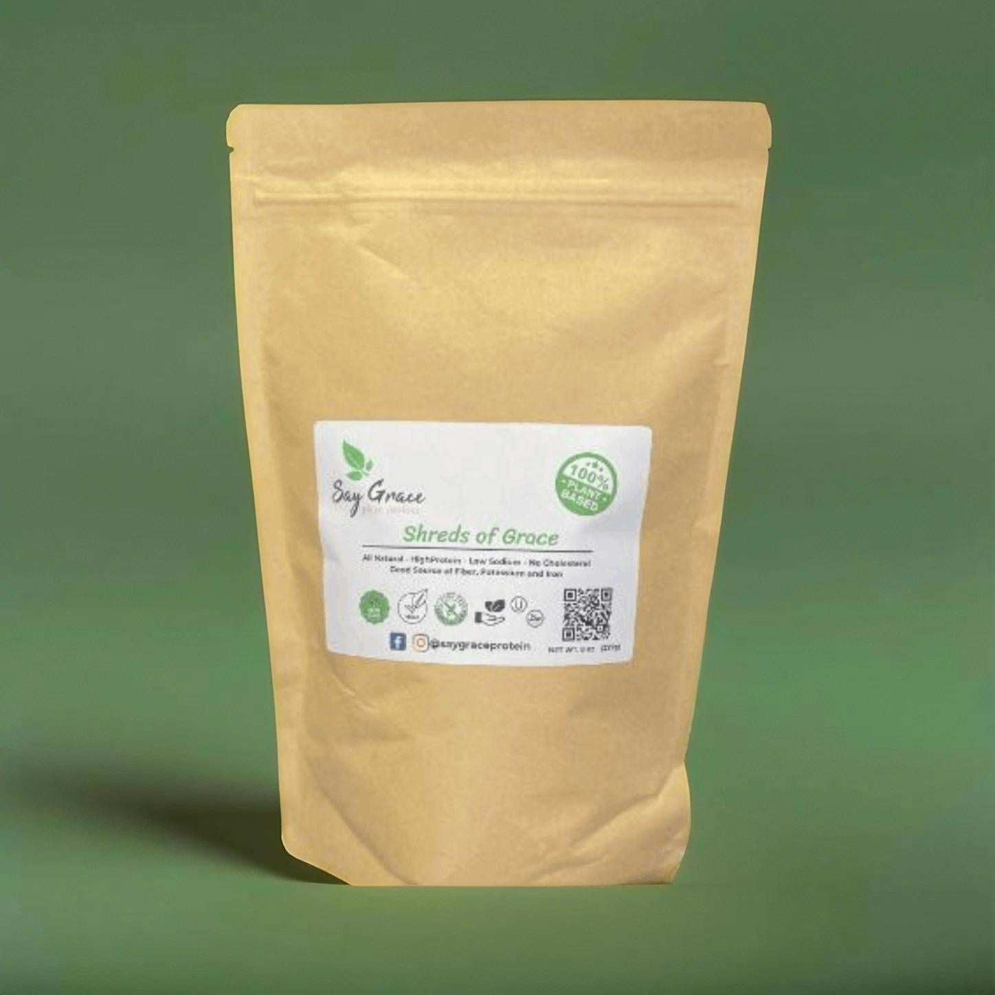 6oz bag of Shreds of Grace, Soy Protein Concentrate (SPC) baked into the versatile shredded chick'n form. Our SPC is high in protein, all plant-based meat alternative, low macronutrients, such as carbs, sugars, and fats! The shreds are great for stir-fry, fajitas, and soups!