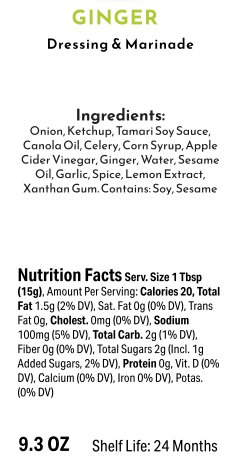 Ingredients: Onion, Ketchup, Tamari Soy Sauce, Canola Oil, Celery, Corn Syrup, Apple Cider Vinegar, Ginger, Water, Sesame Oil, Garlic, Spice, Lemon Extract, Xantham Gum. Contains: Soy, Sesame